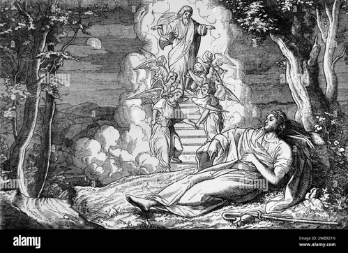 In his dream, Jacob sees a ladder (or stairway, like a ziggurat) reaching from earth to heaven, with angels ascending and descending.